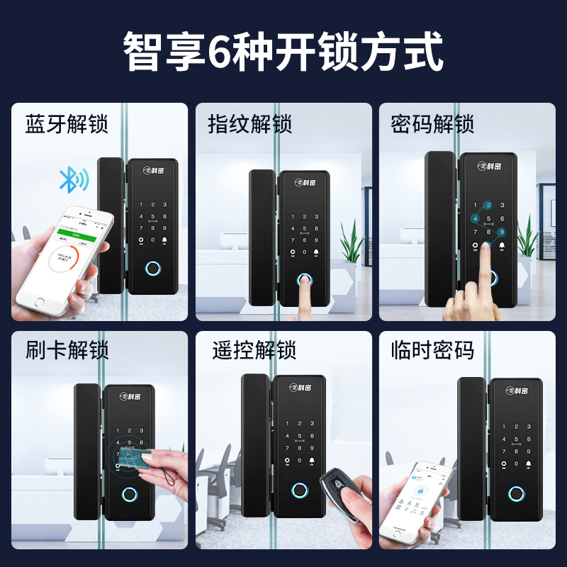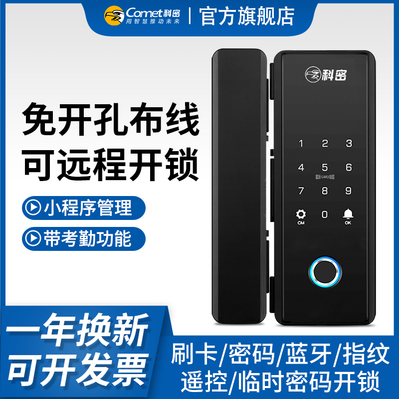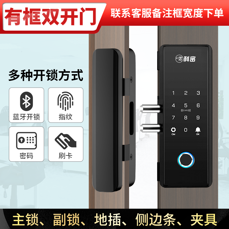 科密玻璃门锁商铺双开门免开孔办公室锁有框单开智能单门密码指纹