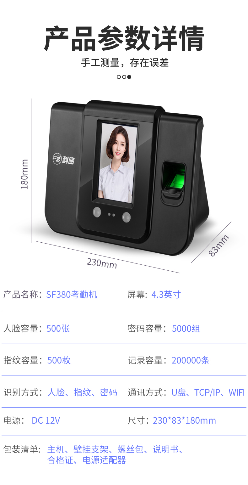 科密(comet) 人脸指纹混合识别考勤机 面部脸部识别考勤机 带一卡通考勤软件SF-380 500人脸 5000指纹 SF-380